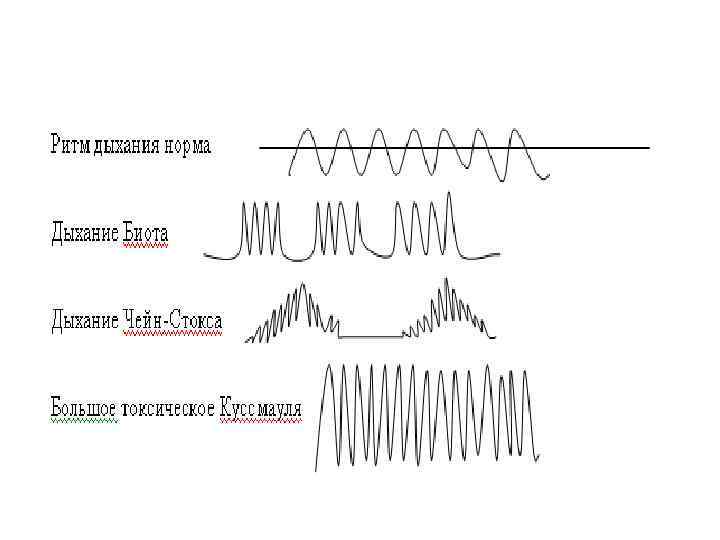 Дыхание Чейна-Стокса - дыхание, при котором после дыхательной паузы появляется сначала поверхностное редкое дыхание, которое постепенно нарастает по глубине и частоте, становится очень шумным, затем постепенно убывает и заканчивается паузой, во время которой больной может быть дезориентирован или терять сознание. Дыхание Биота - ритмичные периоды глубоких дыхательных движений чередуются примерно через равные промежутки времени с продолжительными дыхательными паузами. Дыхание Куссмауля - глубокое редкое дыхание с глубоким шумным вдохом и усиленным выдохом; его наблюдают при глубокой коме.