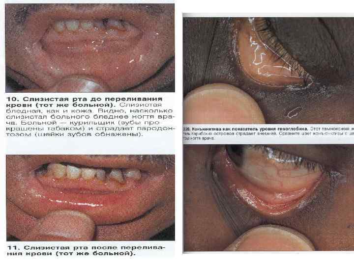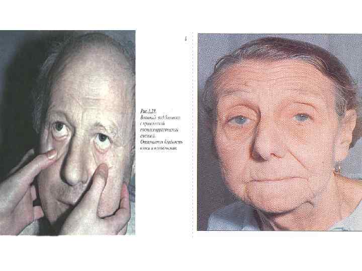 • Цвет кожных покровов Бледность — при анемиях, болезнях почек, микседема (+морщины), сосудистая недосаточность, сниженное содержание меланина (альбинизм, витилиго), пороки сердца, наростающие отеки. • Коричневый(Бронзовый) — болезнь Аддисона, беременность, загар. • Гиперемия(Красный) —алкоголизм, гипертония, , диабет, митральный стеноз, крупозная пневмония, термическое воздействие, лихорадки; местные воспаления, физическое напряжение, климактерический криз. Отравление угарным газом, • Желтый (иктеричность) — повышенное содержание биллирубина • Синий (цианоз) — при накоплении в крови восстановленного гемоглобина(>40 -50 мг/л) — сердечная и легочная недостаточность, пороки сердца, • Местный циноз — при нарушении венозного оттока. При тромбозе верхней полой вены синеет верхняя половина тела, лицо и руки. При тромбозе нижней поой вены — нижняя половина тела. Акроционоз