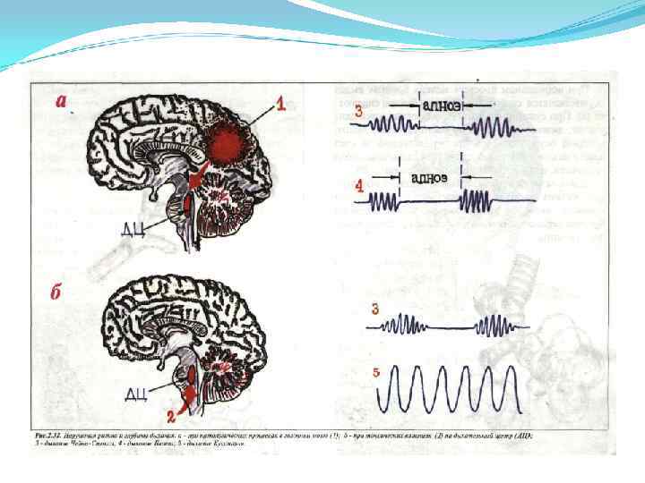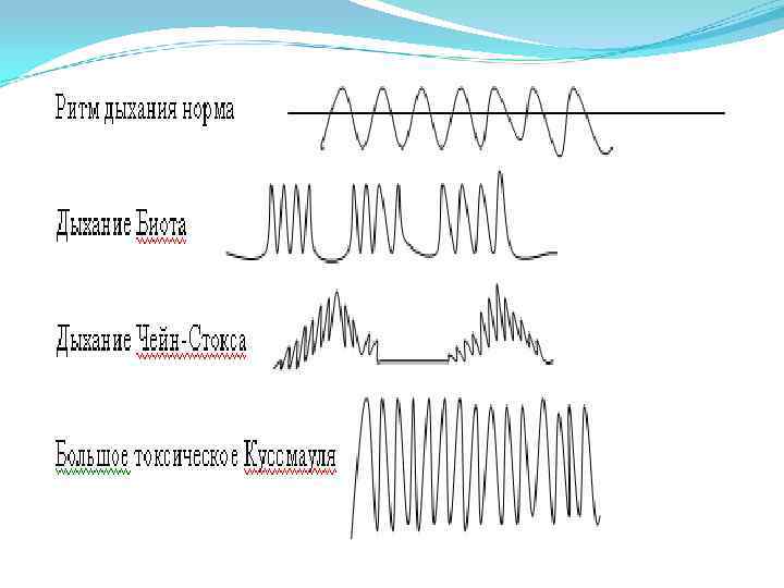 Дыхание Чейна-Стокса - дыхание, при котором после дыхательной паузы появляется сначала поверхностное редкое дыхание, которое постепенно нарастает по глубине и частоте, становится очень шумным, затем постепенно убывает и заканчивается паузой, во время которой больной может быть дезориентирован или терять сознание. Дыхание Биота - ритмичные периоды глубоких дыхательных движений чередуются примерно через равные промежутки времени с продолжительными дыхательными паузами. Дыхание Куссмауля - глубокое редкое дыхание с глубоким шумным вдохом и усиленным выдохом; его наблюдают при глубокой коме.