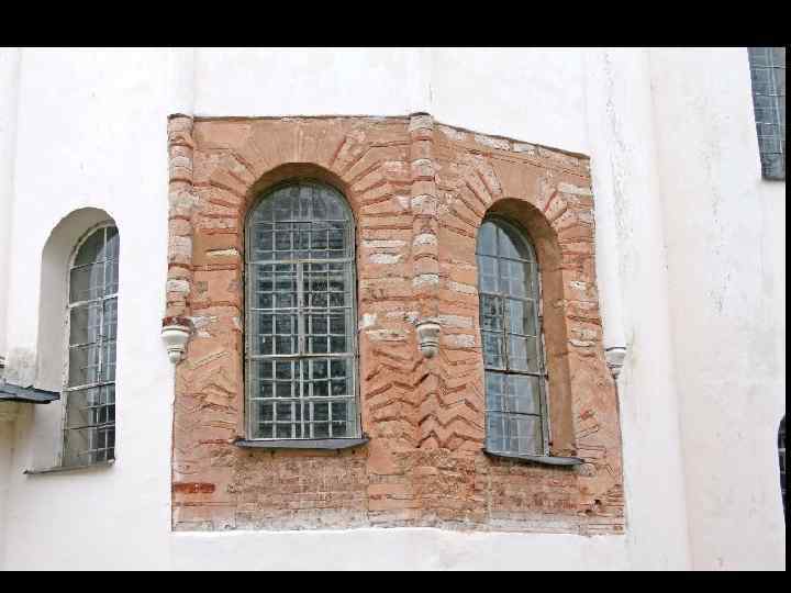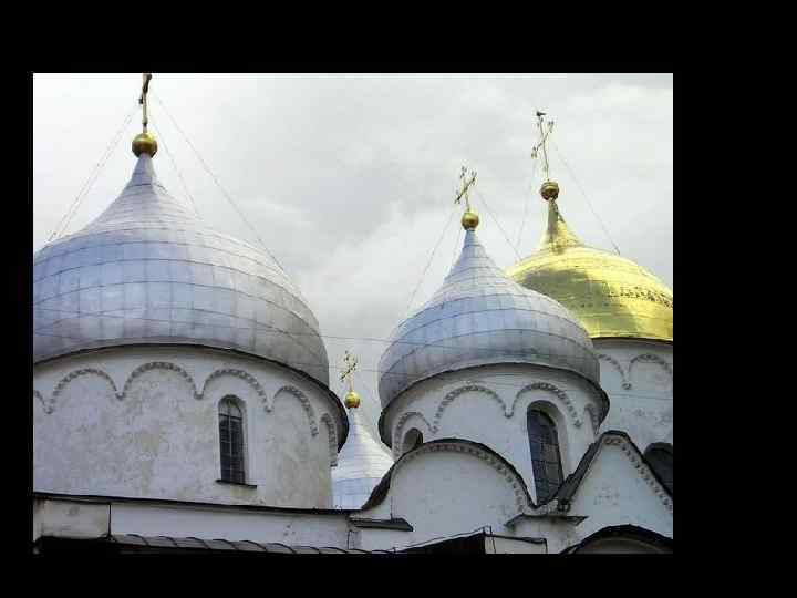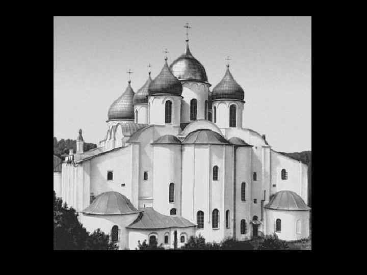 Сравнение с Софией Киевской. Нет пирамидальности. Кубообразность. Позакомарное завершение фасадов. Декоративная закомара Впервые появилось стремление к особой ритмической организации в завершении объема храма.