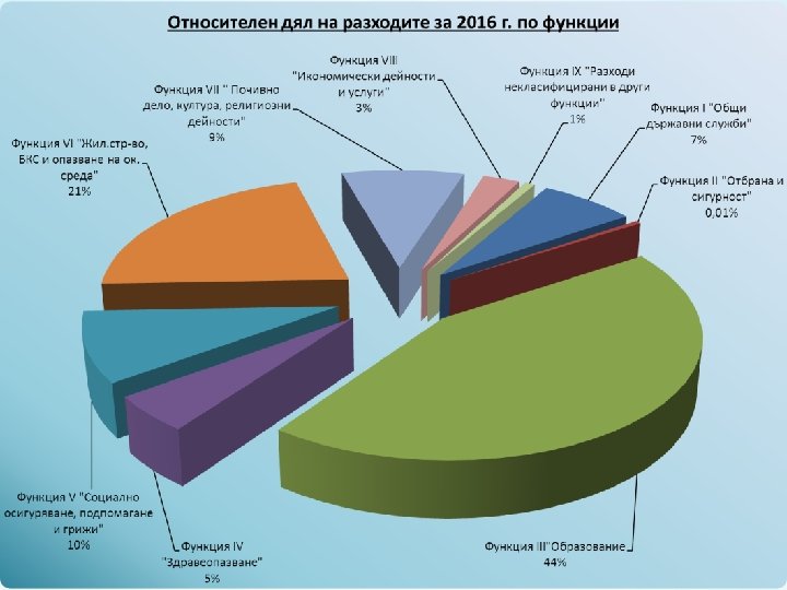 Отчет на разходите по функции Държавни дейности Функции Уточнен план Отчет към 31. 12. 2016 г. 1 925 930 1 794 669 345 074 Функция ІV „Здравеопазване“ Функция V „Соц. осигуряване, подпомагане и грижи“ Уточнен план Отчет към 31. 12. 2016 г. Дофинансиране Уточнен план Отчет към 31. 12. 2016 г. 218 318 20 496 806 Местни дейности Функция І „Общи държавни служби“ Функция ІІ „Отбрана и сигурност“ Функция ІІІ „Образование“ 877 510 846 558 929 957 806 541 19 603 811 1 833 860 1 596 731 122 364 108 728 1 874 134 1 804 824 645 000 555 846 4 059 084 3 769 993 758 784 742 948 196 100 76 100 11 046 205 10 300 630 35 963 1 284 384 1 027 332 Функция VІ „Жилищно строителство, БКС и опазване на околната среда“ Функция VІІ „Почивно дело, култура, религиозни дейности“ Функция VІІІ „Икономически дейности и услуги“ 1 508 190 1 461 133 3 015 932 2 892 320 227 736 1 144 640 1 106 418 860 417 371 437 20 182 348 18 412 888 Функция ІХ „Разходи некласиф. в други функции“ Общо: 30 436 954 28 880 484