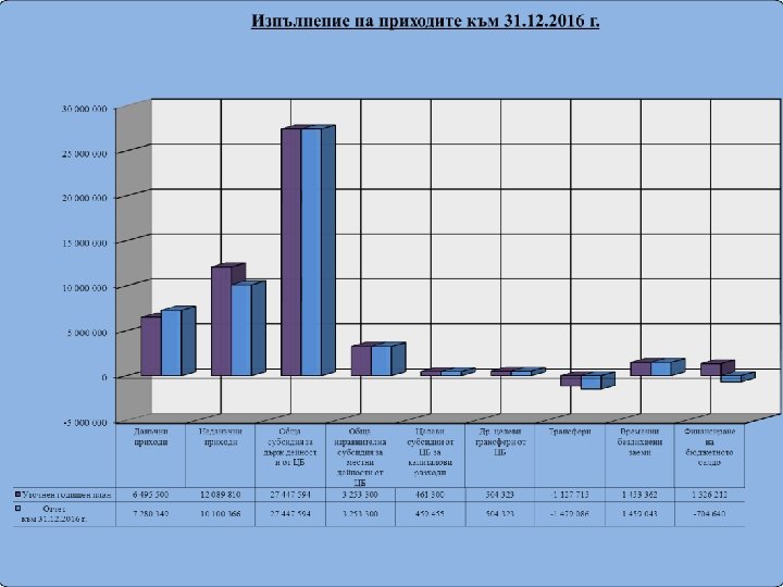 Отчет на разходите към 31. 12. 2016 г. Бюджет`2016 г. І. Разходи за делегирани от държавата дейности - Начален план 28 269 011 лв. - Уточнен план към 31. 12. 2016 г. 30 436 954 лв. - Отчет към 31. 12. 2016 г. 28 880 484 лв. ІІ. Разходи за местни дейности - Начален план 19 960 808 лв. - Уточнен план към 31. 12. 2016 г. 20 182 348 лв. - Отчет към 31. 12. 2016 г. 18 412 888 лв. III. Разходи за дофинансиране на делегирани от държавата дейности - Начален план 1 126 817 лв. - Уточнен план към 31. 12. 2016 г. 1 284 384 лв. - Отчет към 31. 12. 2016 г. 6 1 027 332 лв.