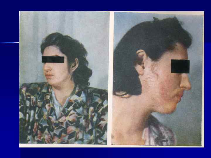 n При гипотиреозе воспаленные веки. Инъекция склер – при феохромоцитоме, болезни Кушинга. Полость рта: утолщение языка и губ при акромегалии, гипотиреозе. Саливация – гипертиреоз; сухость во рту при гипотиреозе; темные, дымчато-серые пигментные пятна на слизистой щек и десен. Шея. Увеличение ее в размерах, с возможной деформацией происходит при увеличенной щитовидной железе.