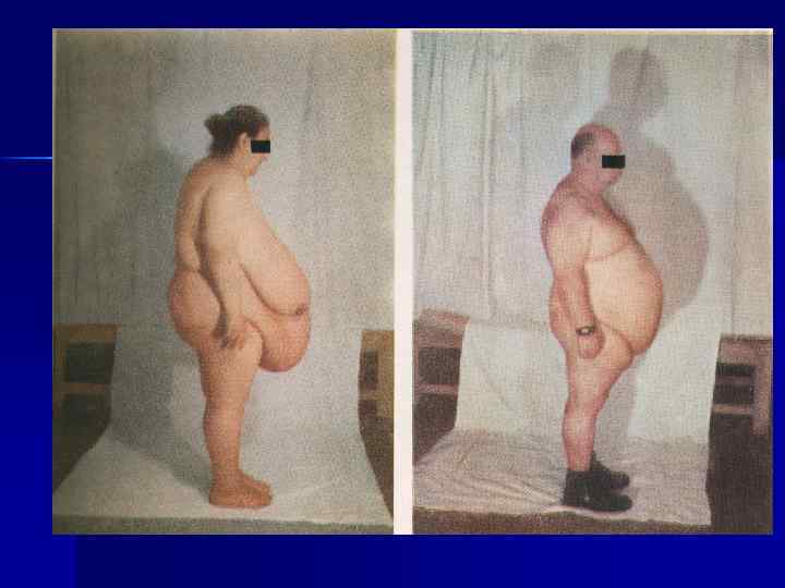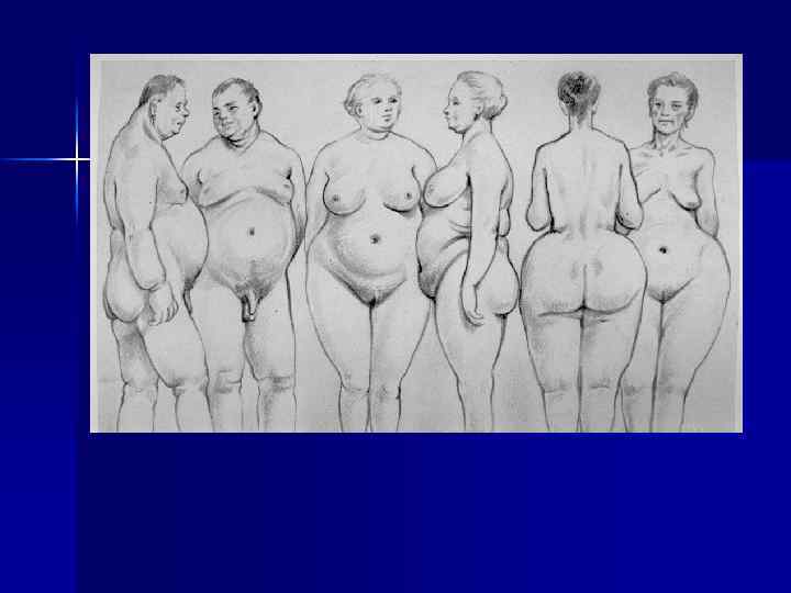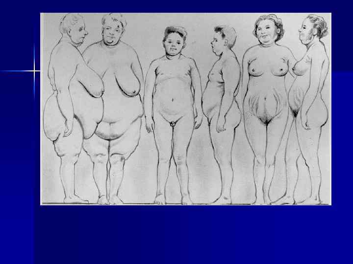 n n Гипоталямическое или церебральное ожирение: круглое лицо с толстым жировым слоем на подбородке, иногда на животе в виде фартука, жировая прослойка на затылке; малые размеры рук и ног. Ожирение при гипотиреозе: более равномерное, больше его на тыльной стороне кистей ( «кошачьи лапки» ), запястьях, лодыжках; в подключичных ямках ( «браслеты» ). Гипоовариальное: больше в обл. бедер, таза, ягодичных областях. Липодистрофический: отложение в ягодичной обл. и ног ( «столбики» ) при худых лице (лицо «ведьмы» ) и верхней части туловища.