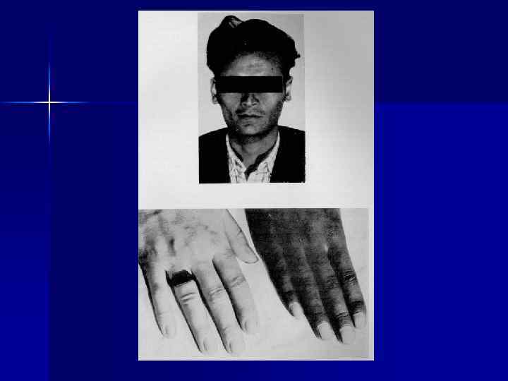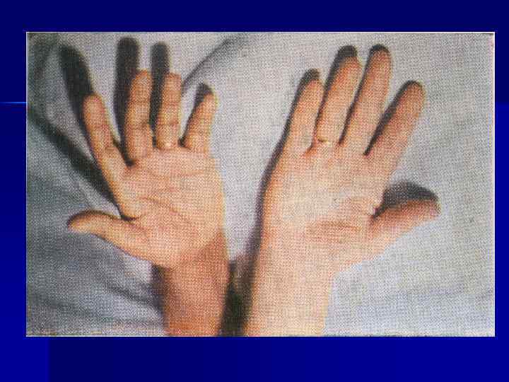 n КОНЕЧНОСТИ При гипогонадизме наблюдаются длинные верхние и нижние конечности. Короткие – при гипергонадизме, гиперфункции надпочечников, гипофизарном карликовом росте, а при микседеме еще и толстые. При акромегалии широкие, удлиненные кисти и стопы. Короткие кисти с очень коротким 5 -м пальцем могут быть признаком гипофункции системы гипоталямус – гипофиз.