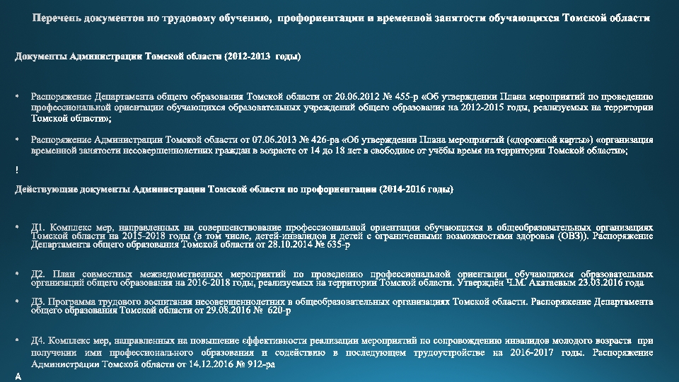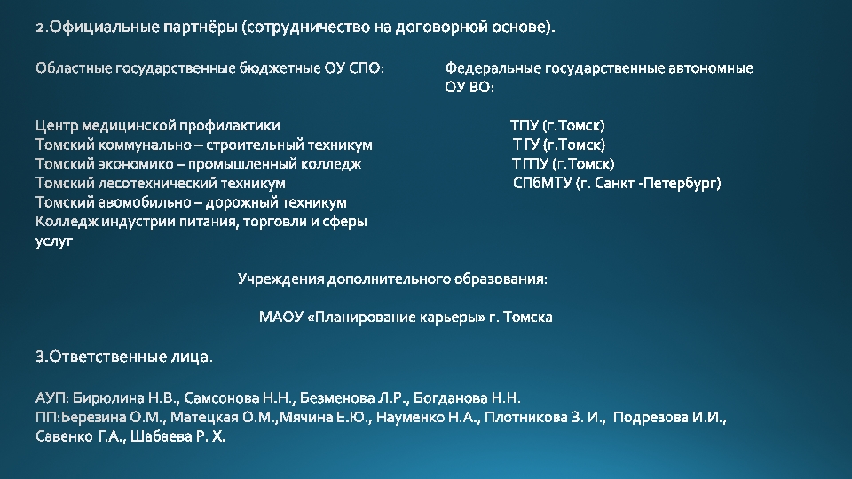 Разделы : 1. Нормативные документы………………………………………. . . с. 3 -4. 2. Официальные партнёры…………………………………………………. с. 5. 3. Ответственные лица……………………………………………………. с. 5. 4. Направления деятельности………………………………………………. . с. 6. • Ранняя профориентация………………………………………………. . с. 7 -8. • Знакомство с профессией (учреждения среднего профессионального образования)……………. . с. 9. • Знакомство с профессией (учреждения высшего профессионального образования…………с. 10 -14. • Содействие успешному поступлению в ВУЗ………………………………. . . с. 15 -17. 5. Если хотите узнать больше……………………………………………. . с. 18 -19.