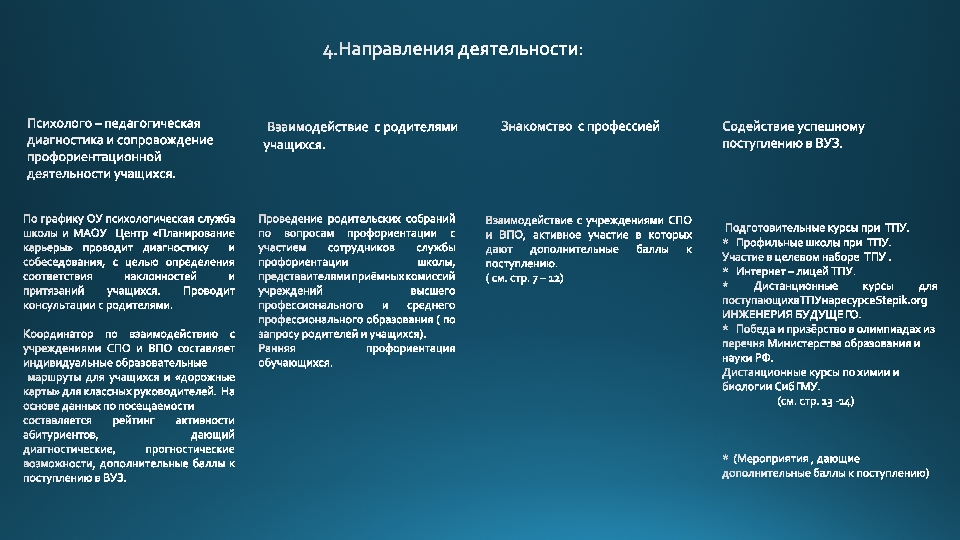 Содействие успешному поступлению в ВУЗ. Мероприятия по повышению конкурентноспособности выпускников МАОУ СОШ № 36 • Подготовительные курсы при ТПУ • Подготовительные курсы на факультете довузовской подготовки ТГУ Специализированные классы ТУСУРа Подготовительные курсы Сиб. ГМУ- сайт Довузовская подготовка по специальности «Педагогика» . Педагогический класс ТГПУ – сайт Школьная академия «Успех» . Педагогический класс ЦПК. «Университетские субботы» : Физика. Химия. Математика. Биология. Информатика (ежегодно февраль-май) * Профильные школы при ТПУ. Участие в целевом наборе ТПУ. * Интернет – лицей ТПУ. * Профориентационный on-line-курс для поступающих в ТПУ на ресурсе Stepik. org «ИНЖЕНЕРИЯ БУДУЩЕГО» • *ТПУ и "Газпром нефть" турнир по нефтегазовой тематике «Умножая таланты» • Участие в городских профориентационных мероприятиях: 1. Встреча обучающихся 8 -11 -х классов общеобразовательных учреждений в режиме on-line с представителями СПО Томской области. 2. Встреча обучающихся 8 -11 -х классов общеобразовательных учреждений в режиме on-line с представителями ВПО Томской области. 3. Профориентационное мероприятие «Город профессий» . • * Победы и призёрство в олимпиадах: 1. Олимпиада НТИ — всероссийская инженерная олимпиада для школьников 9 -11 классов 2. «Homo Novus» - Сиб. ГМУ (химия, биология). 3. Олимпиада ТГАСУ 4. Открытая олимпиада среди учащихся -ТУСУР. • • •