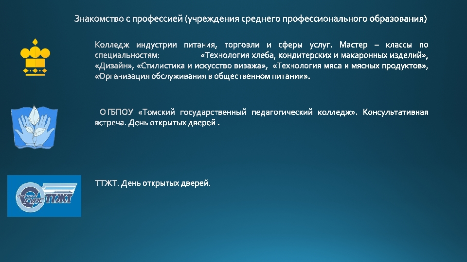 http: //gkskti. ru Томский базовый медицинский колледж http: //tbmc. tomsk. ru Томский коммунально-строительный техникум http: //tomkst. tomsk. ru Томский государственный педагогический колледж pedcollege. tomsk. ru Томский лесотехнический техникум lestexn@mail. tomsknet. ru Томский автомобильно-дорожный техникум Томский медико-фармацевтический колледж Сибирского государственного медицинского университета care@mail. tomsknet. ru mail@ttit. tomsk. ru www. edu. ru/abitur/act. 19/ds. 1/isn. 3408/index. php Томский политехнический техникум politex@tpt. tom. ru tsht 2004@mail. ru www. edu. ru/abitur/act. 19/ds. 1/isn. 3411/index. ph p Томский торгово-экономический техникум ttet@tet. tomsknet. ru Томский экономико-промышленный колледж tept. edu. ru ttgdt. edu. ru