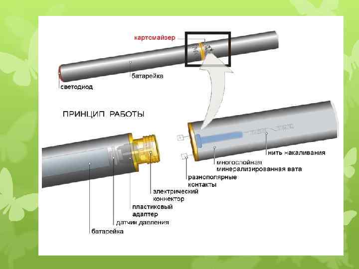 Сравнительные характеристики сигарет Критерии Обычные сигареты Не безопасны, потому как: - в составе табачного дыма содержится около 4000 веществ (канцерогены, аммиак, диоксид углерода и многие другие). Они способны вызывать заболевания, в том числе онкологические, и усугублять течение недугов; - курение – одна из причин бытовых пожаров Свобода использования Нельзя курить в общественных местах, т. к. от этого страдает здоровье окружающих. Чтобы оградить людей от пассивного потребления табачного дыма в последнее время вводится все больше запретов на курение Вкус и аромат Горьковатый привкус, который надолго остается во рту. Запах дыма – малоприятен и очень устойчив. Поэтому волосы и одежда курящего, даже его близких практически всегда пахнут табаком Средняя цена за пачку сигарет – 50 р. По прогнозам стоимость к 2015 году увеличится как минимум в 3 раза Безопасность Стоимость Электронные сигареты Безопасны, поскольку: - в паре единственным веществом, способным влиять на самочувствие человека, является никотин. Пропиленгликоль и ароматизаторы, которые также имеются в составе жидкости эл. сигареты отзывы врачей получили одобрительные. Онкологи, кардиологи и доктора иных специализаций, заявляют, что такие компоненты не опасны для здоровья человека; - пожаробезопасны, т. к. их использование не сопровождается тлением и горением Можно использовать в любых общественных местах, в том числе и при большом скоплении людей (например, в кино или ресторане). Учеными установлено, что эффект пассивного курения полностью отсутствует Не оставляют неприятного привкуса. Ароматы могут быть различными, начиная от классического табака, заканчивая экзотическими фруктами. Запах эл. сигареты – тонок, нежен и не беспокоит окружающих Стоимость устройства зависит от марки и модели. Те, у кого уже есть эл. сигарета, купить картридж к ней могут по той же цене, что и пачку сигарет. Приобретение жидкости для самостоятельной заправки позволит экономить на парении еще больше. Стоимость 1 заправки (равной 20 обычным сигаретам), в 1, 5 -2 раза ниже средней цены картриджа