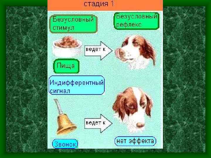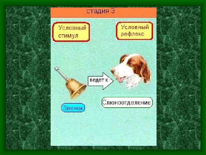 Условный рефлекс • Понятие, введенное И. П. Павловым для обозначения динамической связи между условным раздражителем и реакцией индивида, первоначально основанной на безусловном раздражителе. • При выработке классического УР последовательность событий в опыте никак не зависит от поведения животного.