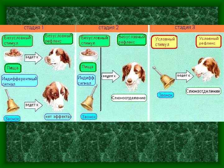 Правила выработки условных рефлексов: • повторное сочетание действия ранее индифферентного • • • условного раздражителя с действием подкрепляющего безусловного раздражителя; некоторое предшествование во времени действия индифферентного агента действию подкрепляющего раздражителя; нормальное функциональное состояние организма; отсутствие других видов активной деятельности; наличие соответствующей мотивации; надпороговая интенсивность условного раздражителя.