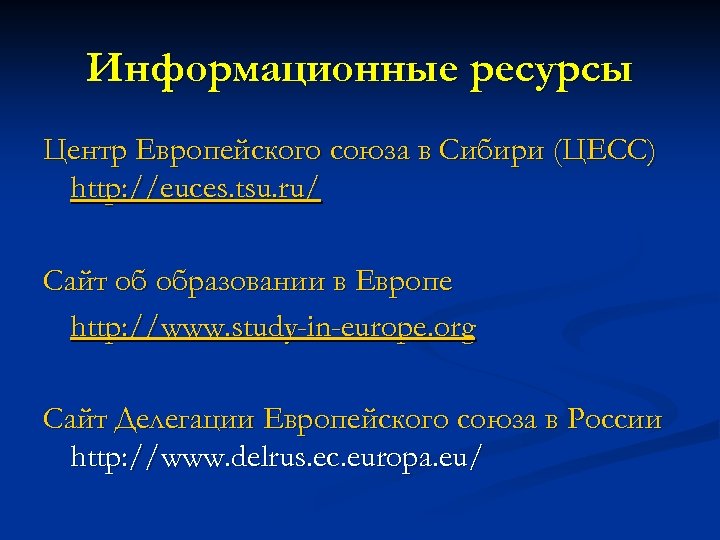 Информационные ресурсы Центр Европейского союза в Сибири (ЦЕСС) http: //euces. tsu. ru/ Сайт об образовании в Европе http: //www. study-in-europe. org Сайт Делегации Европейского союза в России http: //www. delrus. ec. europa. eu/
