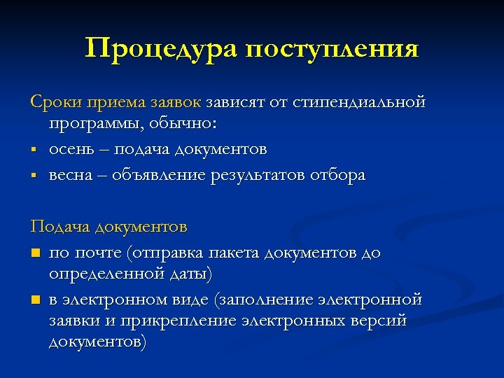 Процедура поступления Сроки приема заявок зависят от стипендиальной программы, обычно: § осень – подача документов § весна – объявление результатов отбора Подача документов n по почте (отправка пакета документов до определенной даты) n в электронном виде (заполнение электронной заявки и прикрепление электронных версий документов)