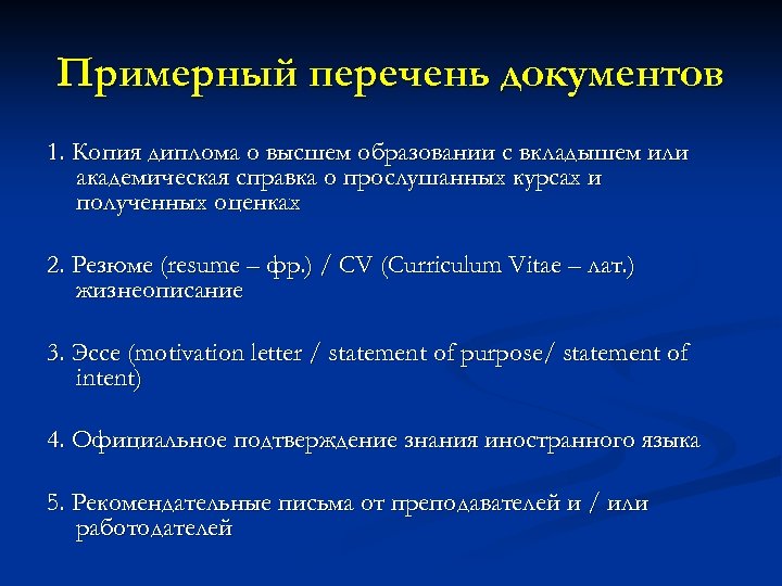 Примерный перечень документов 1. Копия диплома о высшем образовании с вкладышем или академическая справка о прослушанных курсах и полученных оценках 2. Резюме (resume – фр. ) / CV (Curriculum Vitae – лат. ) жизнеописание 3. Эссе (motivation letter / statement of purpose/ statement of intent) 4. Официальное подтверждение знания иностранного языка 5. Рекомендательные письма от преподавателей и / или работодателей
