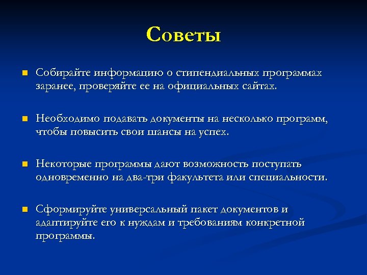 Советы n Собирайте информацию о стипендиальных программах заранее, проверяйте ее на официальных сайтах. n Необходимо подавать документы на несколько программ, чтобы повысить свои шансы на успех. n Некоторые программы дают возможность поступать одновременно на два-три факультета или специальности. n Сформируйте универсальный пакет документов и адаптируйте его к нуждам и требованиям конкретной программы.