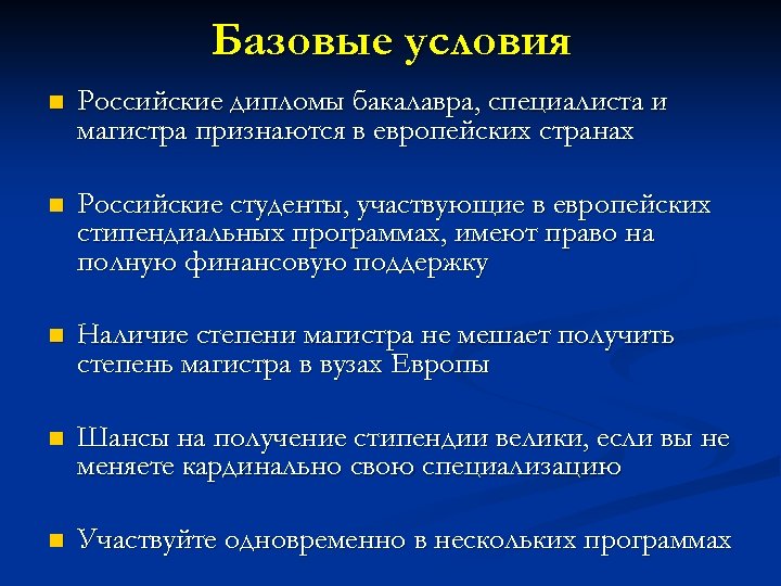 Базовые условия n Российские дипломы бакалавра, специалиста и магистра признаются в европейских странах n Российские студенты, участвующие в европейских стипендиальных программах, имеют право на полную финансовую поддержку n Наличие степени магистра не мешает получить степень магистра в вузах Европы n Шансы на получение стипендии велики, если вы не меняете кардинально свою специализацию n Участвуйте одновременно в нескольких программах