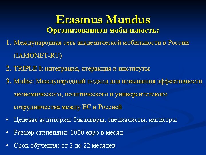 Erasmus Mundus Организованная мобильность: 1. Международная сеть академической мобильности в Росcии (IAMONET-RU) 2. TRIPLE I: интеграция, итеракция и институты 3. Multic: Международный подход для повышения эффективности экономического, политического и университетского сотрудничества между ЕС и Россией • Целевая аудитория: бакалавры, специалисты, магистры • Размер стипендии: 1000 евро в месяц • Срок обучения: от 3 до 22 месяцев