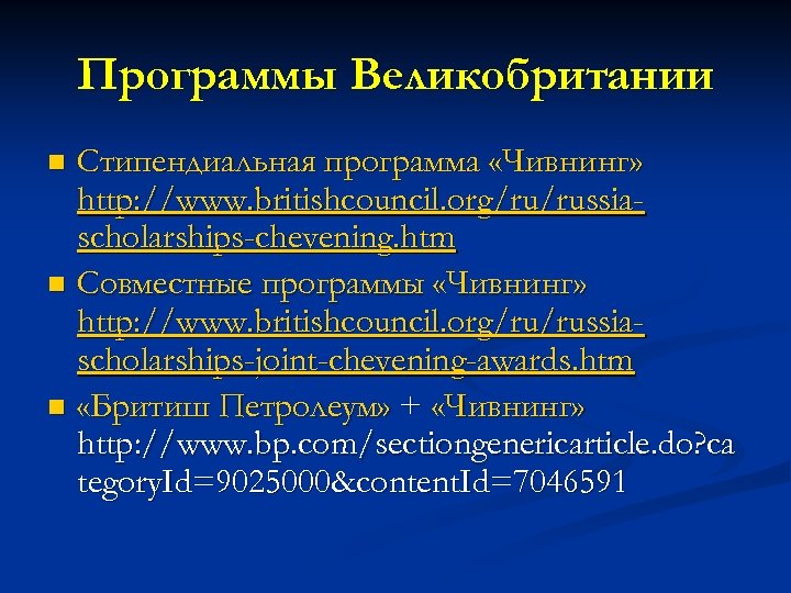 Программы Великобритании Стипендиальная программа «Чивнинг» http: //www. britishcouncil. org/ru/russiascholarships-chevening. htm n Совместные программы «Чивнинг» http: //www. britishcouncil. org/ru/russiascholarships-joint-chevening-awards. htm n «Бритиш Петролеум» + «Чивнинг» http: //www. bp. com/sectiongenericarticle. do? ca tegory. Id=9025000&content. Id=7046591 n