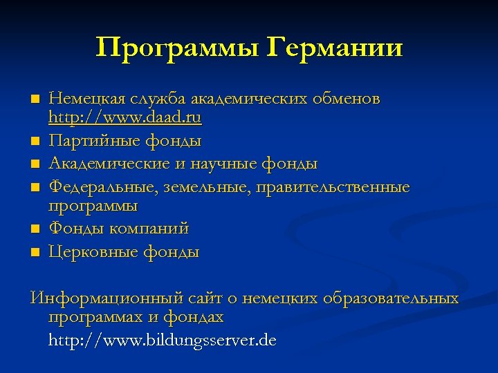 Программы Германии n n n Немецкая служба академических обменов http: //www. daad. ru Партийные фонды Академические и научные фонды Федеральные, земельные, правительственные программы Фонды компаний Церковные фонды Информационный сайт о немецких образовательных программах и фондах http: //www. bildungsserver. de