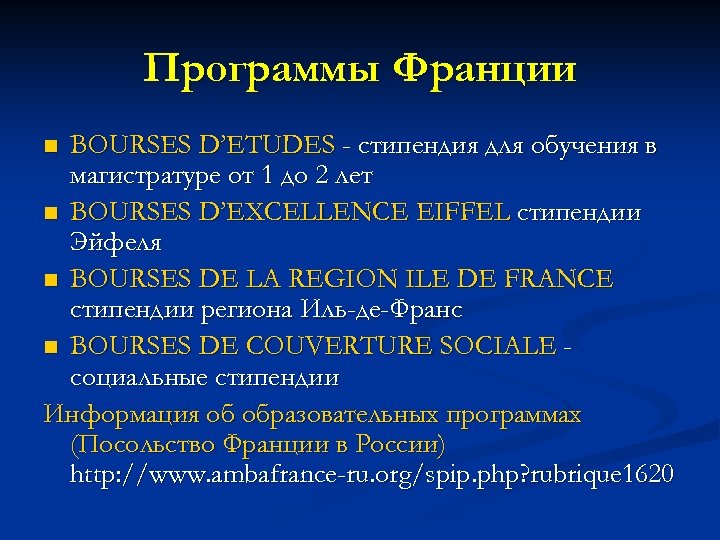 Программы Франции BOURSES D’ETUDES - стипендия для обучения в магистратуре от 1 до 2 лет n BOURSES D’EXCELLENCE EIFFEL стипендии Эйфеля n BOURSES DE LA REGION ILE DE FRANCE стипендии региона Иль-де-Франс n BOURSES DE COUVERTURE SOCIALE социальные стипендии Информация об образовательных программах (Посольство Франции в России) http: //www. ambafrance-ru. org/spip. php? rubrique 1620 n