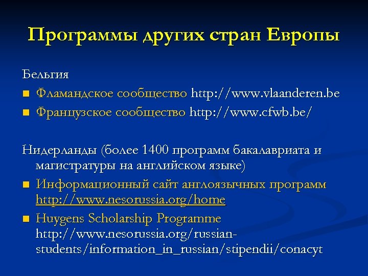 Программы других стран Европы Бельгия n Фламандское сообщество http: //www. vlaanderen. be n Французское сообщество http: //www. cfwb. be/ Нидерланды (более 1400 программ бакалавриата и магистратуры на английском языке) n Информационный сайт англоязычных программ http: //www. nesorussia. org/home n Huygens Scholarship Programme http: //www. nesorussia. org/russianstudents/information_in_russian/stipendii/conacyt