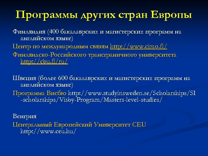 Программы других стран Европы Финляндия (400 бакалаврских и магистерских программ на английском языке) Центр по международным связям http: //www. cimo. fi/ Финляндско-Российского трансграничного университета http: //cbu. fi/ru/ Швеция (более 600 бакалаврских и магистерских программ на английском языке) Программа Висбю http: //www. studyinsweden. se/Scholarships/SI -scholarships/Visby-Program/Masters-level-studies/ Венгрия Центральный Европейский Университет CEU http: //www. ceu. hu/