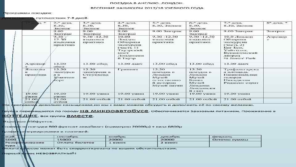 СТОИМОСТЬ И ВЗНОСЫ Общая стоимость поездки составляет: 800 фунтов в пересчете по курсу на момент оплаты + 20000 р авиабилеты + 6800 стоимость визового сбора Остаток после оплаты авиабилетов переходит в зачет к основной сумме(800 фунтов) Оплата взносов возможна как этапная, так и единовременная (по курсу на момент оплаты)