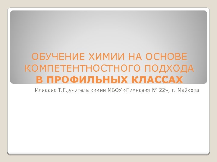 ОБУЧЕНИЕ ХИМИИ НА ОСНОВЕ КОМПЕТЕНТНОСТНОГО ПОДХОДА В ПРОФИЛЬНЫХ КЛАССАХ Илиадис Т. Г. , учитель химии МБОУ «Гимназия № 22» , г. Майкопа