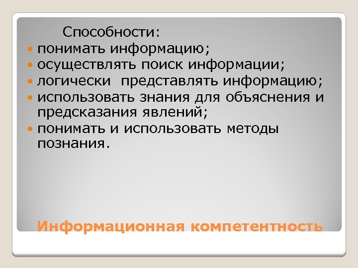 Способности: понимать информацию; осуществлять поиск информации; логически представлять информацию; использовать знания для объяснения и предсказания явлений; понимать и использовать методы познания. Информационная компетентность