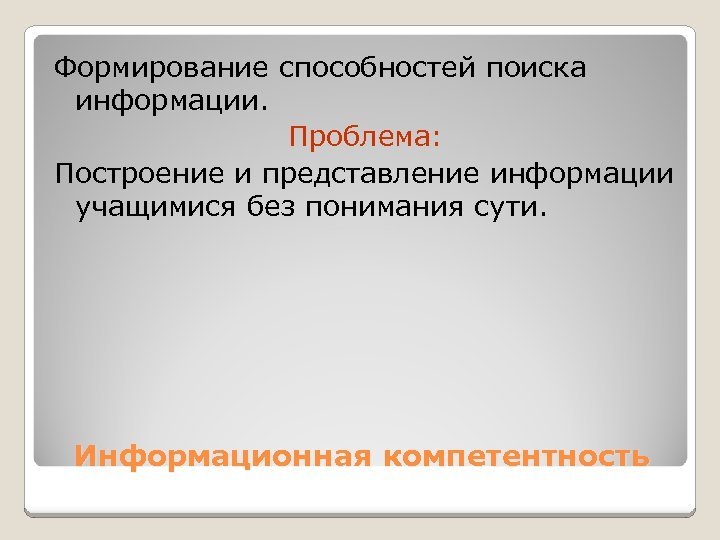 Формирование способностей поиска информации. Проблема: Построение и представление информации учащимися без понимания сути. Информационная компетентность