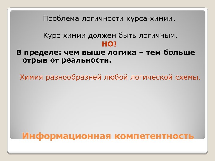 Проблема логичности курса химии. Курс химии должен быть логичным. НО! В пределе: чем выше логика – тем больше отрыв от реальности. Химия разнообразней любой логической схемы. Информационная компетентность
