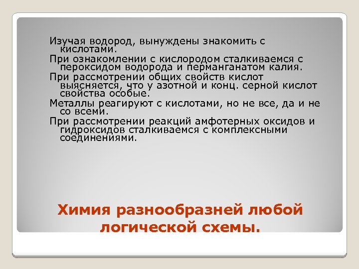 Изучая водород, вынуждены знакомить с кислотами. При ознакомлении с кислородом сталкиваемся с пероксидом водорода и перманганатом калия. При рассмотрении общих свойств кислот выясняется, что у азотной и конц. серной кислот свойства особые. Металлы реагируют с кислотами, но не все, да и не со всеми. При рассмотрении реакций амфотерных оксидов и гидроксидов сталкиваемся с комплексными соединениями. Химия разнообразней любой логической схемы.
