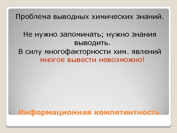 Проблема выводных химических знаний. Не нужно запоминать; нужно знания выводить. В силу многофакторности хим. явлений многое вывести невозможно! Информационная компетентность