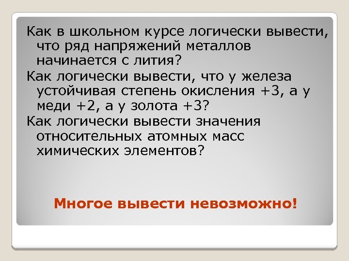 Как в школьном курсе логически вывести, что ряд напряжений металлов начинается с лития? Как логически вывести, что у железа устойчивая степень окисления +3, а у меди +2, а у золота +3? Как логически вывести значения относительных атомных масс химических элементов? Многое вывести невозможно!