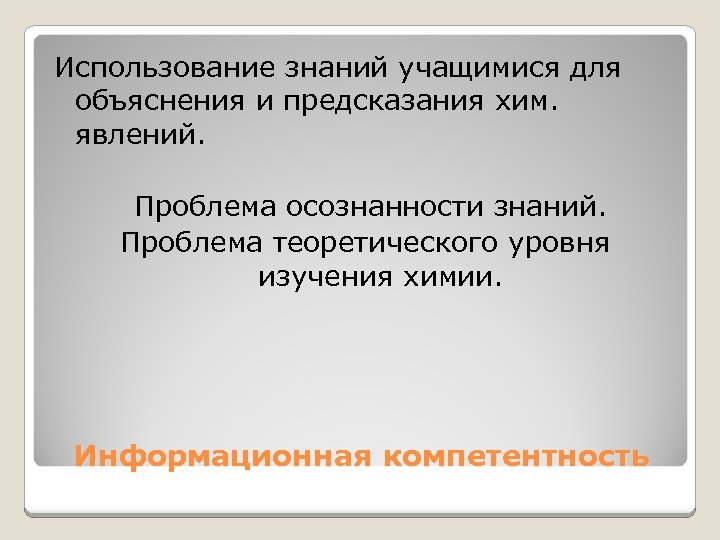 Использование знаний учащимися для объяснения и предсказания хим. явлений. Проблема осознанности знаний. Проблема теоретического уровня изучения химии. Информационная компетентность