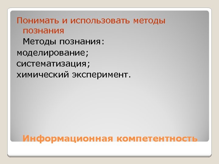 Понимать и использовать методы познания Методы познания: моделирование; систематизация; химический эксперимент. Информационная компетентность
