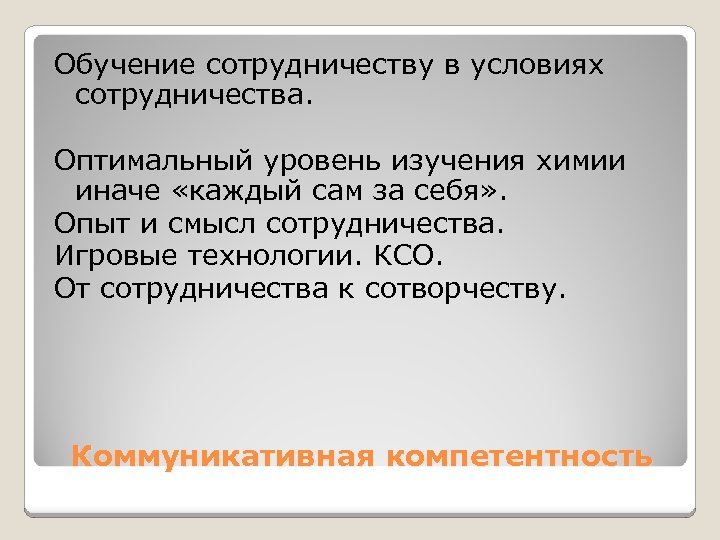Обучение сотрудничеству в условиях сотрудничества. Оптимальный уровень изучения химии иначе «каждый сам за себя» . Опыт и смысл сотрудничества. Игровые технологии. КСО. От сотрудничества к сотворчеству. Коммуникативная компетентность