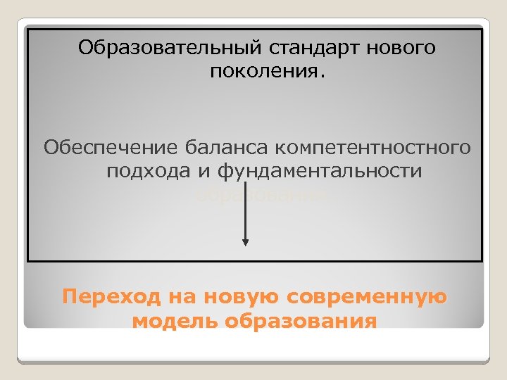 Образовательный стандарт нового поколения. Обеспечение баланса компетентностного подхода и фундаментальности образования. Переход на новую современную модель образования