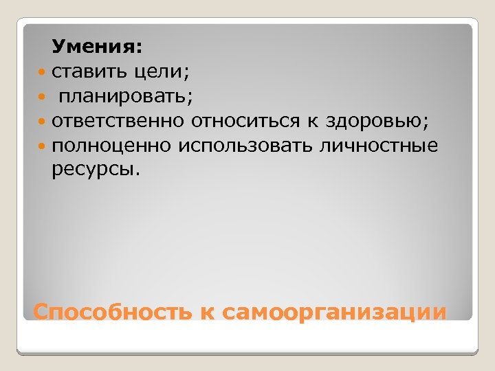 Умения: ставить цели; планировать; ответственно относиться к здоровью; полноценно использовать личностные ресурсы. Способность к самоорганизации