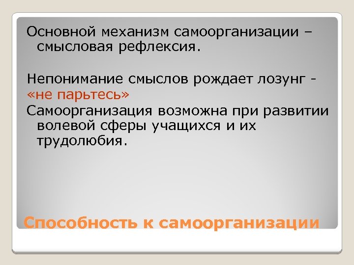 Основной механизм самоорганизации – смысловая рефлексия. Непонимание смыслов рождает лозунг «не парьтесь» Самоорганизация возможна при развитии волевой сферы учащихся и их трудолюбия. Способность к самоорганизации