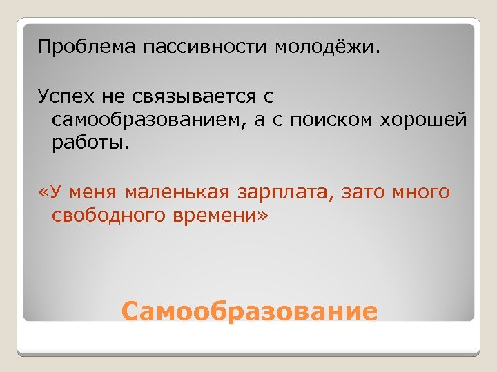 Проблема пассивности молодёжи. Успех не связывается с самообразованием, а с поиском хорошей работы. «У меня маленькая зарплата, зато много свободного времени» Самообразование