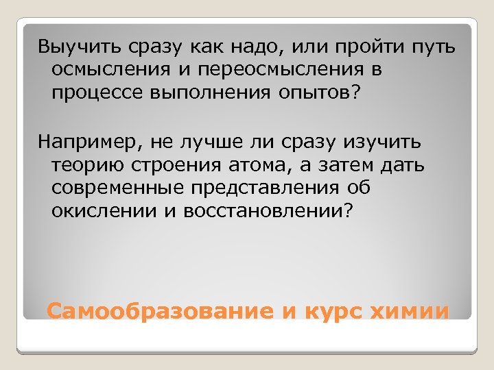Выучить сразу как надо, или пройти путь осмысления и переосмысления в процессе выполнения опытов? Например, не лучше ли сразу изучить теорию строения атома, а затем дать современные представления об окислении и восстановлении? Самообразование и курс химии