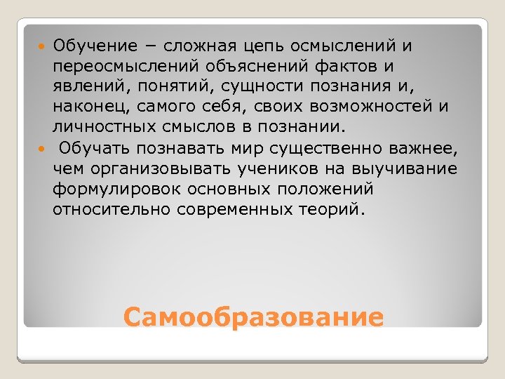 Обучение − сложная цепь осмыслений и переосмыслений объяснений фактов и явлений, понятий, сущности познания и, наконец, самого себя, своих возможностей и личностных смыслов в познании. Обучать познавать мир существенно важнее, чем организовывать учеников на выучивание формулировок основных положений относительно современных теорий. Самообразование