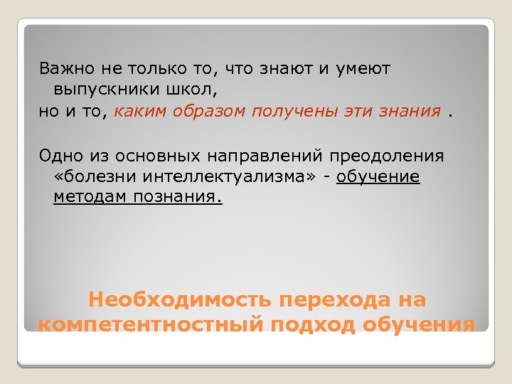 Важно не только то, что знают и умеют выпускники школ, но и то, каким образом получены эти знания. Одно из основных направлений преодоления «болезни интеллектуализма» - обучение методам познания. Необходимость перехода на компетентностный подход обучения