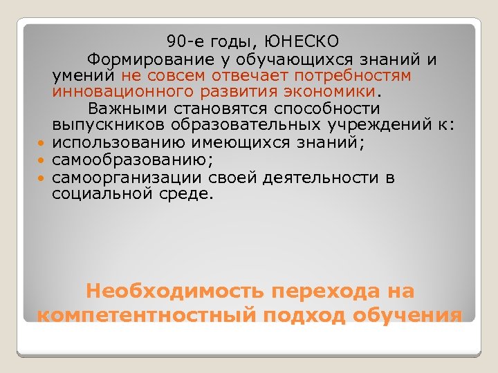 90 -е годы, ЮНЕСКО Формирование у обучающихся знаний и умений не совсем отвечает потребностям инновационного развития экономики. Важными становятся способности выпускников образовательных учреждений к: использованию имеющихся знаний; самообразованию; самоорганизации своей деятельности в социальной среде. Необходимость перехода на компетентностный подход обучения