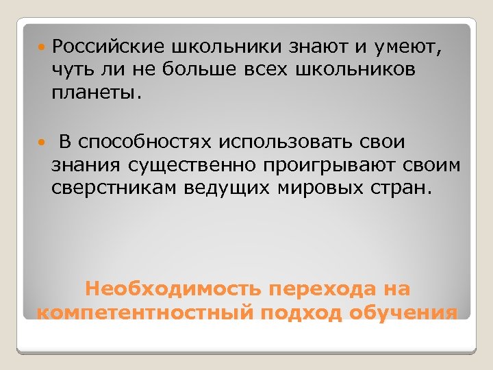Российские школьники знают и умеют, чуть ли не больше всех школьников планеты. В способностях использовать свои знания существенно проигрывают своим сверстникам ведущих мировых стран. Необходимость перехода на компетентностный подход обучения
