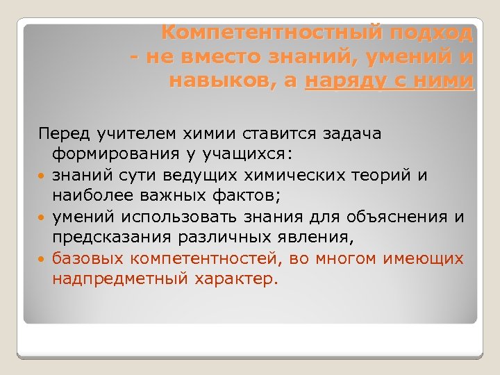 Компетентностный подход - не вместо знаний, умений и навыков, а наряду с ними Перед учителем химии ставится задача формирования у учащихся: знаний сути ведущих химических теорий и наиболее важных фактов; умений использовать знания для объяснения и предсказания различных явления, базовых компетентностей, во многом имеющих надпредметный характер.
