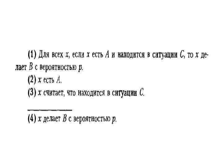 Условия д-н модели: • • Трехступенчатая 1) из посылок должно следовать заключение. 2) все посылки должны быть правильные. 3)одна из посылок должна содержать общее правило. • + • 4) Эксплананс должен содержать эмпирические данные (частный факт).