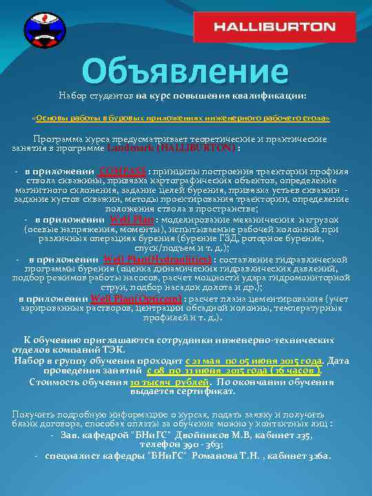 Объявление Набор студентов на курс повышения квалификации: «Основы работы в буровых приложениях инженерного рабочего стола» Программа курса предусматривает теоретические и практические занятия в программе Landmark (HALLIBURTON) : - в приложении COMPASS : принципы построения траектории профиля ствола скважины, привязка картографических объектов, определение магнитного склонения, задание целей бурения, привязка устьев скважин задание кустов скважин, методы проектирования траектории, определение положения ствола в пространстве; - в приложении Well Plan : моделирование механических нагрузок (осевые напряжения, моменты), испытываемые рабочей колонной при различных операциях бурения (бурение ГЗД, роторное бурение, спуск/подъем и т. д. ); - в приложении Well Plan(Hydraulitics) : составление гидравлической программы бурения (оценка динамических гидравлических давлений, подбор режимов работы насосов, расчет мощности удара гидромониторной струи, подбор насадок долота и др. ); -в приложении Well Plan(Opticem) : расчет плана цементирования (учет аэрированных растворов, центрации обсадной колонны, температурных профилей и т. д. ). К обучению приглашаются сотрудники инженерно-технических отделов компаний ТЭК. Набор в группу обучения проходит с 21 мая по 05 июня 2015 года. Дата проведения занятий с 08 по 11 июня 2015 года ( 16 часов ). Стоимость обучения 10 тысяч рублей. По окончании обучения выдается сертификат. Получить подробную информацию о курсах, подать заявку и получить бланк договора, способах оплаты за обучение можно у контактных лиц : - Зав. кафедрой "БНи. ГС" Двойников М. В, кабинет 235, телефон 390 - 363; - специалист кафедры "БНи. ГС" Романова Т. Н. , кабинет 326 а.