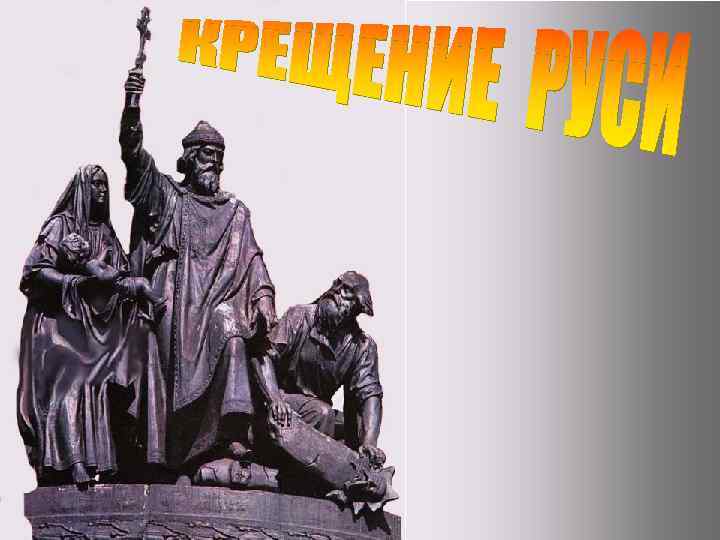 Вернувшись в Киев, князь велел изрубить языческих идолов, а главного Перуна сбросить в Днепр. Через несколько дней крестились его сыновья и бояре. Затем князь разослал по всему городу гонцов с повелением жителям собраться на берегу Днепра. И наступило утро крещения. «И вошли они в воду. И стояли одни по шею, а другие по грудь» . Некоторые держали младенцев, а священники молились. Был август 988 года. Крещение Руси. Художник В. Васнецов, 19 век